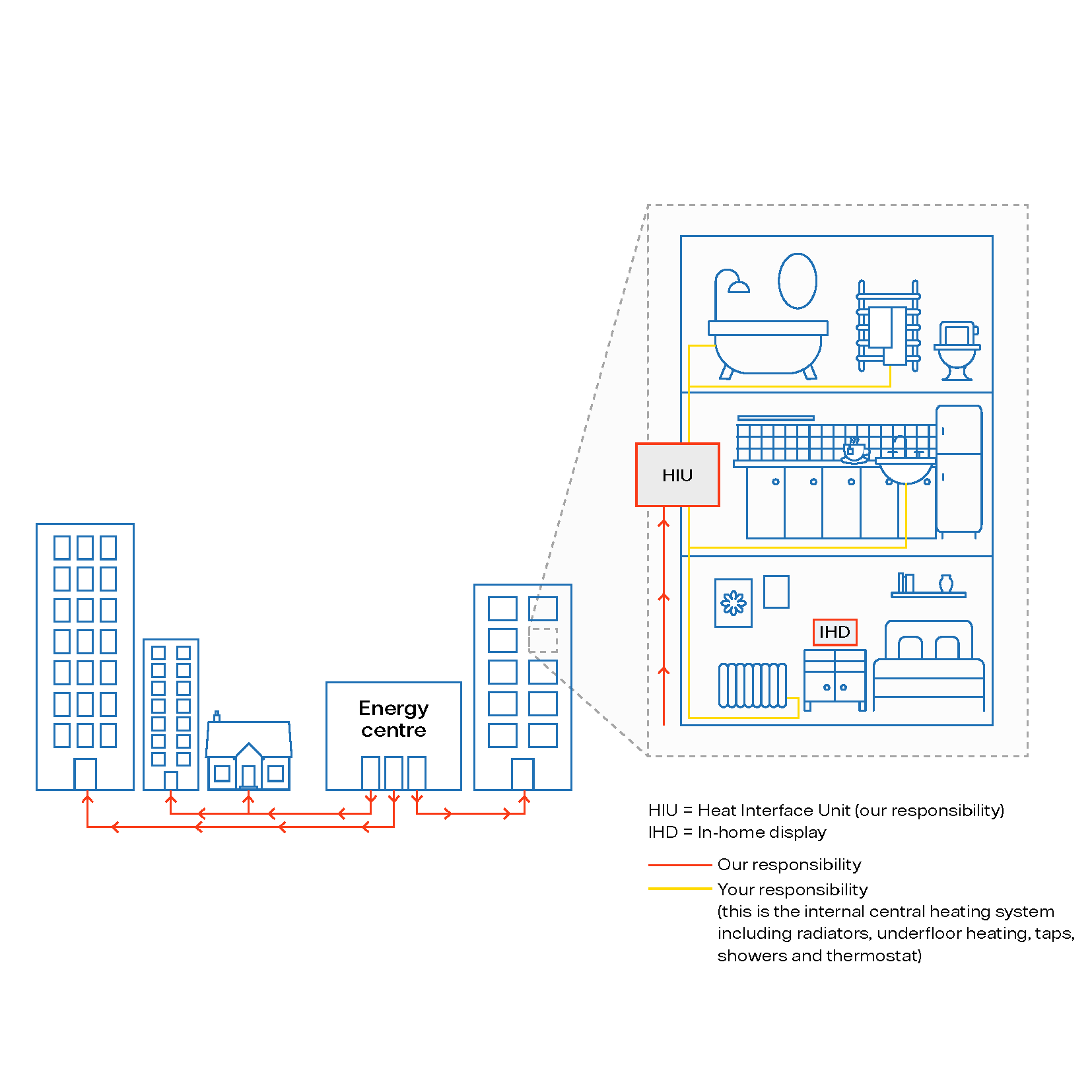 We will take care of the heat network from the energy centre up to and including the HIU and heat meter in your property. The central heating system inside your property remains your responsibility to manage (or if you rent, your landlord’s). This includes radiators, underfloor heating, thermostats, heating programmers, showers and taps.